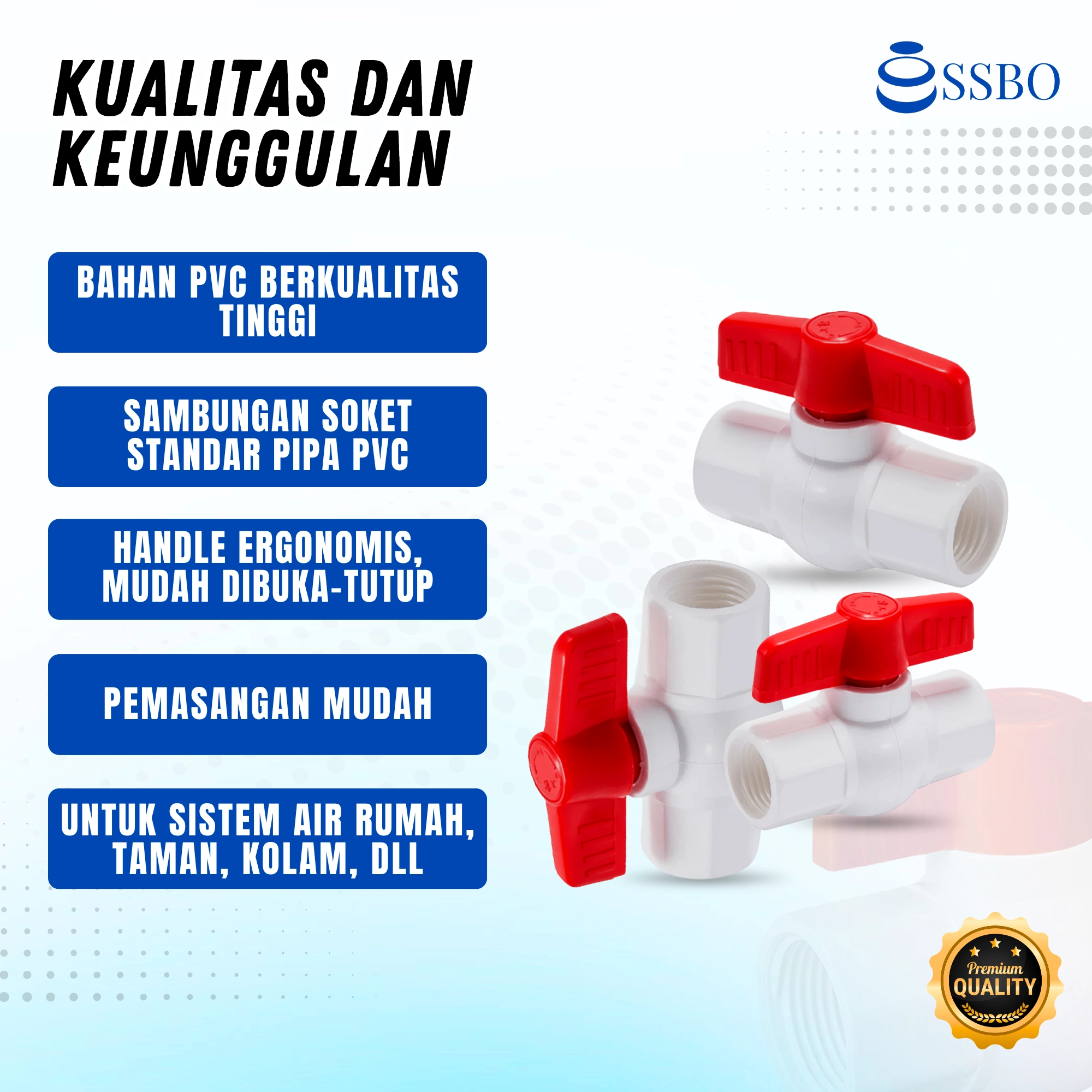 Stop Kran SSBO dari material PVC berkualitas, ideal untuk memutus dan mengalirkan air pada sistem pipa rumah, taman, atau instalasi air lainnya.