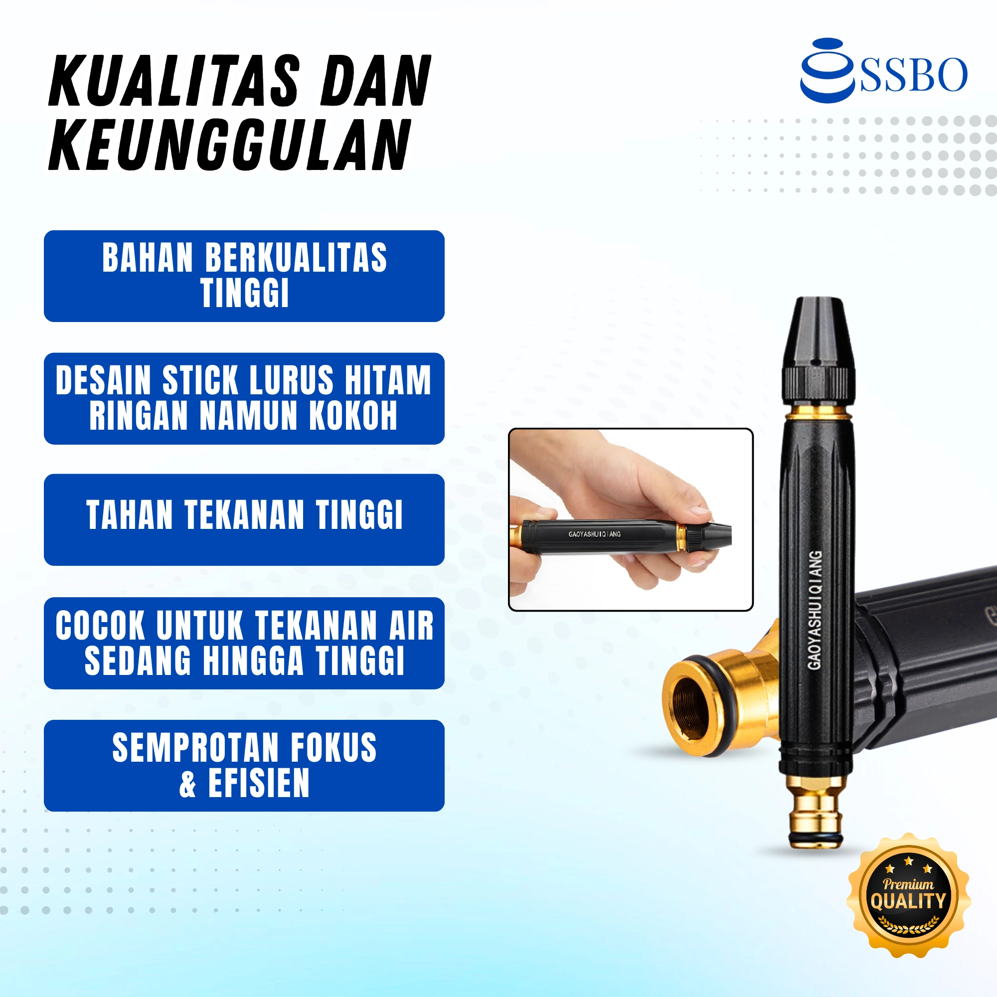 SSBO Nozzle Stik Warna Hitam adalah semprotan air dengan tekanan tinggi. Dilengkapi ujung kuningan anti karat. Cocok untuk berbagai kebutuhan rumah tangga seperti mencuci mobil, motor, dan menyiram tanaman.