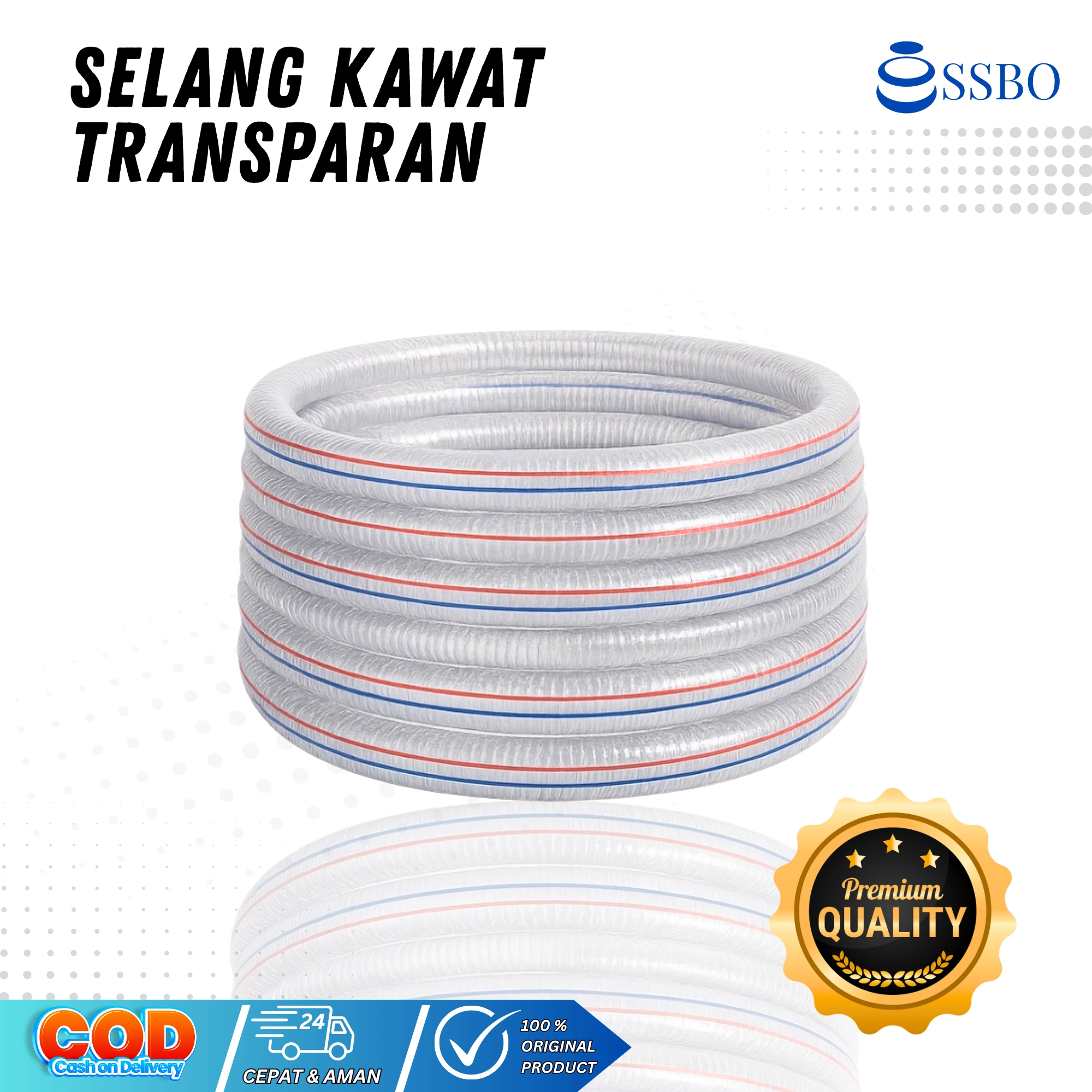 SSBO Selang Kawat merupakan selang fleksibel berbahan PVC transparan yang diperkuat dengan spiral kawat baja di bagian dalamnya. Konstruksi ini membuat selang sangat ideal untuk aliran air, udara, atau cairan bertekanan karena tidak mudah terlipat, tahan tekanan, dan tahan lama.